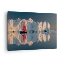 Quadro em tela - Um veleiro com uma vela vermelha tendo como pano de fundo uma geleira - 70x50cm - No fim do mundo - Decoração de parede moderna para a sala de estar e quarto ARTTOR