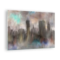 Quadro em vidro - Imagem abstrata de uma cidade com arranha-céus - 70x50cm - Composição de aço, pedra e névoa - Decoração de parede moderna para a sala de estar e quarto ARTTOR