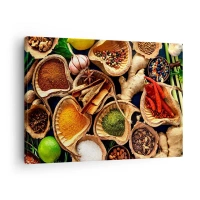 Quadro em tela - Ervas e especiarias em potes sobre fundo rústico - 70x50cm - Magias da cozinha - Decoração de parede moderna para a sala de estar e quarto ARTTOR