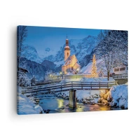 Quadro em tela - Paisagem de inverno com igreja, ponte e montanhas ao entardecer - 70x50cm - O Espírito do Natal - Decoração de parede moderna para a sala de estar e quarto ARTTOR