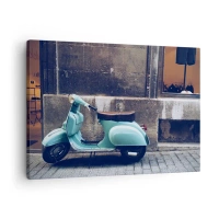 Quadro em tela - Uma scooter retrô estacionada contra um muro de pedra - 70x50cm - Ambiente inesquecível - Decoração de parede moderna para a sala de estar e quarto ARTTOR