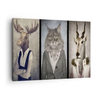 Quadro em tela - Um tríptico com figuras de animais em roupas elegantes sobre um fundo estilizado - 70x50cm - A pele animal está de volta à moda - Decoração de parede moderna para a sala de estar e quarto ARTTOR