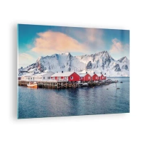 Quadro em vidro - Casas de pesca vermelhas no fiorde com montanhas ao fundo - 70x50cm - Refpugio do Norte - Decoração de parede moderna para a sala de estar e quarto ARTTOR