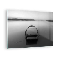 Quadro em vidro - Um velho barco em uma superfície calma de água em preto e branco - 70x50cm - Saudade e melancolia - Decoração de parede moderna para a sala de estar e quarto ARTTOR