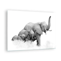 Quadro em vidro - Família de elefantes pretos e brancos na natureza - 70x50cm - Um, dois, três - Decoração de parede moderna para a sala de estar e quarto ARTTOR