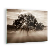 Quadro em vidro - Uma árvore na névoa da manhã com raios de sol brilhando através dos galhos - 70x50cm - Uma árvore só de boas notícias - Decoração de parede moderna para a sala de estar e quarto ARTTOR