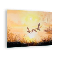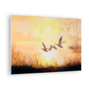 Quadro em vidro - Três patos voando sobre um lago ao nascer do sol - 70x50cm - O início de uma longa viagem - Decoração de parede moderna para a sala de estar e quarto ARTTOR