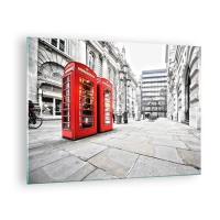 Quadro em vidro - Cabines telefônicas vermelhas com o pano de fundo de uma rua da cidade - 70x50cm - Bem-vindo a Londres - Decoração de parede moderna para a sala de estar e quarto ARTTOR