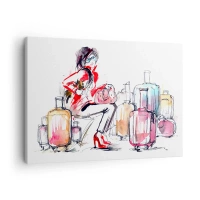 Quadro em tela - Uma mulher com malas em uma ilustração dinâmica em aquarela - 70x50cm - Vamos sentar antes da viagem - Decoração de parede moderna para a sala de estar e quarto ARTTOR
