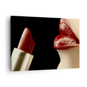 Quadro em tela - Lábios vermelhos e batom em fundo preto - 70x50cm - Sensualidade e brilho do carmim - Decoração de parede moderna para a sala de estar e quarto ARTTOR