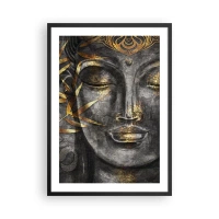 Pôster com moldura preta - Retrato de Buda com brilho dourado e elementos de folhas de bambu - 50x70cm - Sinta a paz - Decoração de parede moderna para a sala de estar e quarto ARTTOR