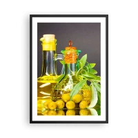 Pôster com moldura preta - Garrafas de azeite e azeitonas verdes - 50x70cm - Natureza morta com azeitonas e azeite - Decoração de parede moderna para a sala de estar e quarto ARTTOR