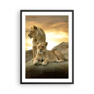 Pôster com moldura preta - Duas leoas contra o pôr do sol - 50x70cm - Majestade real - Decoração de parede moderna para a sala de estar e quarto ARTTOR