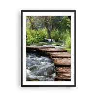 Pôster com moldura preta - Uma ponte de madeira sobre um riacho caudaloso - 50x70cm - Sobre a cascata espumosa - Decoração de parede moderna para a sala de estar e quarto ARTTOR