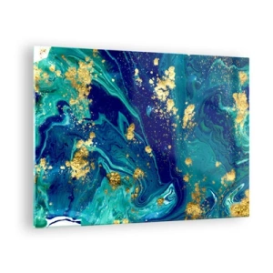 Quadro em vidro - Um padrão abstrato em tons de turquesa e azul marinho com detalhes dourados - 70x50cm - Flocos de sol - Decoração de parede moderna para a sala de estar e quarto ARTTOR