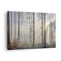 Quadro em tela - Uma floresta em meio a uma leve neblina com raios de sol brilhando através das árvores - 70x50cm - O nevoeiro também acordou - Decoração de parede moderna para a sala de estar e quarto ARTTOR