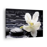 Quadro em tela - Uma orquídea branca sobre um fundo de pedras pretas e água. - 70x50cm - Estudo a preto e branco - Decoração de parede moderna para a sala de estar e quarto ARTTOR