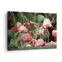 Quadro em tela - Um grupo de flamingos em um ambiente tropical cercado por palmeiras - 70x50cm - Fofocas da tarde - Decoração de parede moderna para a sala de estar e quarto ARTTOR