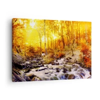 Quadro em tela - Floresta de outono com um riacho entre folhas douradas - 70x50cm - Pedras emolduradas em ouro e platina - Decoração de parede moderna para a sala de estar e quarto ARTTOR