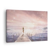 Quadro em tela - Uma mulher em um cais em um cenário mágico de pôr do sol - 70x50cm - À luz de um sonho - Decoração de parede moderna para a sala de estar e quarto ARTTOR