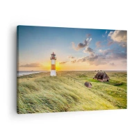 Quadro em tela - Um farol com prados e casas ao sol ao fundo - 70x50cm - Entre as ondas - Decoração de parede moderna para a sala de estar e quarto ARTTOR