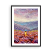 Pôster com moldura preta - Um campo de lavanda com uma mulher usando um chapéu tendo como pano de fundo uma montanha. - 50x70cm - No mundo da lavanda - Decoração de parede moderna para a sala de estar e quarto ARTTOR