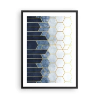 Pôster com moldura preta - Composição geométrica em tons de azul marinho e dourado com hexágonos - 50x70cm - Composição em ritmo sincopado - Decoração de parede moderna para a sala de estar e quarto ARTTOR