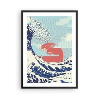 Pôster com moldura preta - Onda gráfica de inspiração japonesa com um sol vermelho - 50x70cm - Das inspirações japonesas - Decoração de parede moderna para a sala de estar e quarto ARTTOR