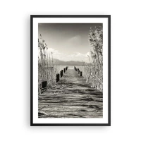 Pôster com moldura preta - Uma ponte de madeira entre os juncos sobre um lago em tons sépia - 50x70cm - No silêncio da relva - Decoração de parede moderna para a sala de estar e quarto ARTTOR
