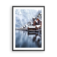 Pôster com moldura preta - Paisagem de inverno de uma vila de montanha perto do lago - 50x70cm - Na decoração de inverno - Decoração de parede moderna para a sala de estar e quarto ARTTOR