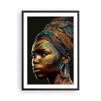 Pôster com moldura preta - Retrato de uma mulher com um lenço colorido e maquiagem étnica - 50x70cm - Rainha africana - Decoração de parede moderna para a sala de estar e quarto ARTTOR
