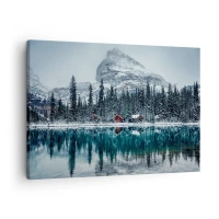 Quadro em tela - Paisagem de inverno com casas de campo na floresta perto de um lago congelado - 70x50cm - Retiro canadense - Decoração de parede moderna para a sala de estar e quarto ARTTOR