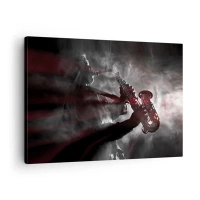 Quadro em tela - Saxofonista em fumaça no palco em preto e vermelho atmosférico - 70x50cm - Nos fumos do jazz - Decoração de parede moderna para a sala de estar e quarto ARTTOR