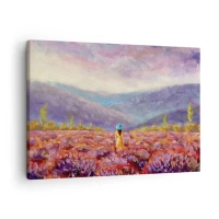 Quadro em tela - Uma mulher usando um chapéu caminhando por um campo de lavanda. - 70x50cm - No mundo da lavanda - Decoração de parede moderna para a sala de estar e quarto ARTTOR