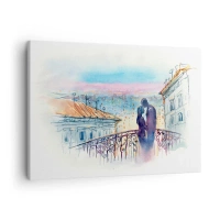 Quadro em tela - Casal romântico em uma varanda com vista para a cidade - 70x50cm - Amantes parisienses - Decoração de parede moderna para a sala de estar e quarto ARTTOR