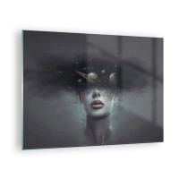 Quadro em vidro - Uma mulher com planetas na cabeça em uma composição surreal - 70x50cm - E os planetas estão a enlouquecer... - Decoração de parede moderna para a sala de estar e quarto ARTTOR