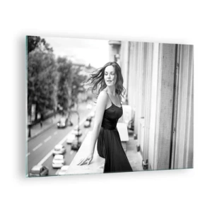Quadro em vidro - Uma mulher de vestido preto em uma varanda em estilo parisiense - 70x50cm - Certamente uma parisiense - Decoração de parede moderna para a sala de estar e quarto ARTTOR