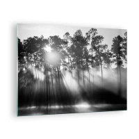 Quadro em vidro - Árvores pretas e brancas em uma floresta com raios de sol na névoa - 70x50cm - O sol imparável - Decoração de parede moderna para a sala de estar e quarto ARTTOR