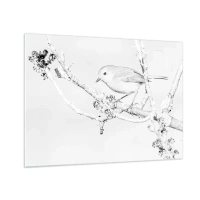 Quadro em vidro - Um pássaro pousado em um galho em uma cena monocromática de inverno. - 70x50cm - Manhã de inverno - Decoração de parede moderna para a sala de estar e quarto ARTTOR