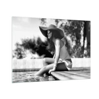 Quadro em vidro - Mulher usando chapéu sentada à beira da piscina em preto e branco - 70x50cm - Sonho de verão - Decoração de parede moderna para a sala de estar e quarto ARTTOR