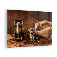 Quadro em vidro - Cafeteira, xícaras e um saco de grãos de café - 70x50cm - O charme do café - aroma e sabor - Decoração de parede moderna para a sala de estar e quarto ARTTOR