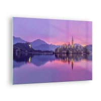 Quadro em vidro - Uma igreja em uma ilha com montanhas e um pôr do sol ao fundo - 70x50cm - Ilha de conto de fadas ao anoitecer - Decoração de parede moderna para a sala de estar e quarto ARTTOR