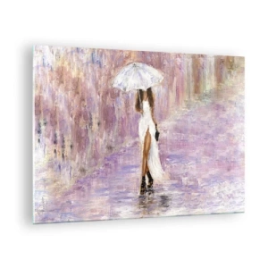 Quadro em vidro - Figura de uma mulher com um guarda-chuva em uma cena de chuva lilás - 70x50cm - Na chuva lilás - Decoração de parede moderna para a sala de estar e quarto ARTTOR
