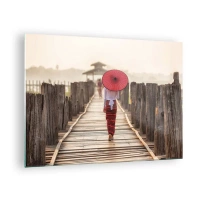 Quadro em vidro - Uma mulher com um guarda-chuva vermelho em uma ponte de madeira - 70x50cm - Na ponte velha - Decoração de parede moderna para a sala de estar e quarto ARTTOR