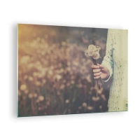 Quadro em vidro - Uma mão segurando um buquê de dentes-de-leão contra um campo desfocado - 70x50cm - Fique com isto, por favor - Decoração de parede moderna para a sala de estar e quarto ARTTOR