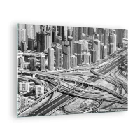 Quadro em vidro - Panorama em preto e branco da cidade com um cruzamento de rodovia - 70x50cm - Dubai – uma cidade impossível - Decoração de parede moderna para a sala de estar e quarto ARTTOR