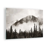 Quadro em vidro - Paisagem montanhosa com floresta e neblina em tons sépia - 70x50cm - O soberano de granito - Decoração de parede moderna para a sala de estar e quarto ARTTOR