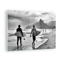 Quadro em vidro - Surfistas na praia com pranchas, composição em preto e branco - 70x50cm - Samba para uma onda - Decoração de parede moderna para a sala de estar e quarto ARTTOR
