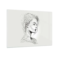 Quadro em vidro - Um esboço em preto e branco de uma mulher com os olhos fechados em uma linha delicada. - 70x50cm - Retrato em pensamento - Decoração de parede moderna para a sala de estar e quarto ARTTOR