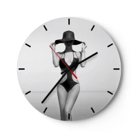 Relógio de parede - Relógio em vidro - Uma mulher de maiô preto e chapéu contra o mar - 30x30cm - Meu nome é: Elegância - Decoração de parede moderna para a sala de estar, cozinha e quarto ARTTOR